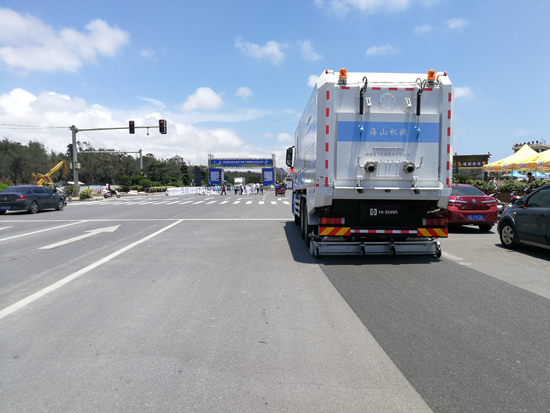 ? 公路賽事路線近20公里,為了讓騎行者更舒適的享受賽事,海山機械道路污染清除車對賽道主要路段進行深度清潔,可對道路縫隙中各種污染物完全吸收,作業后道路一塵不染,無任何水漬,不需要噴灑水和噴霧,徹底解決清掃車、灑水車作業后造成的二次污染,并從源頭遏制道路揚塵。